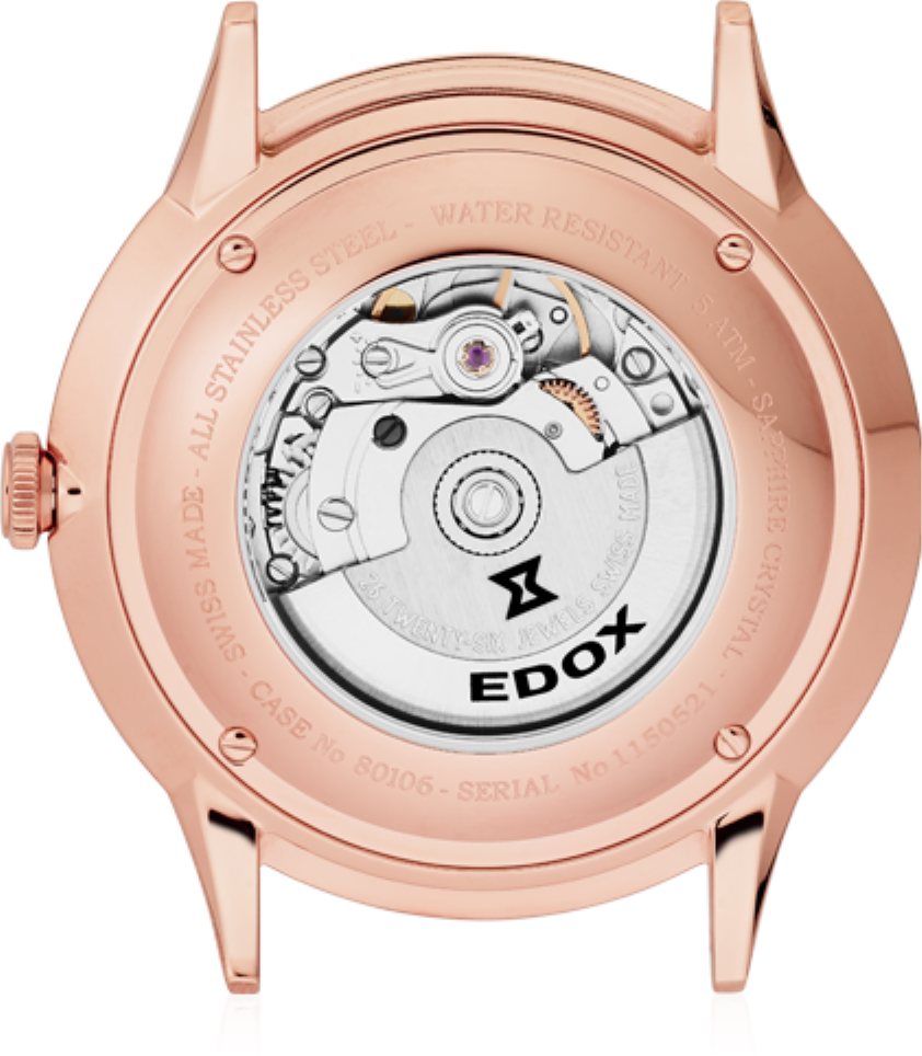 Funkce:Čas, datum, strojek Swiss Sellita SW 200 (26 kamenů), rezerva chodu 40 hodin, polokmity setrvačky 28.800/h = diference 2 - 4 vteřiny denně, automatický + ruční nátah, zapínání pásku - motýlková spona (praktické a pevné elegantní zapínání), průhledné zadní víčko pouzdra pro náhled na strojek